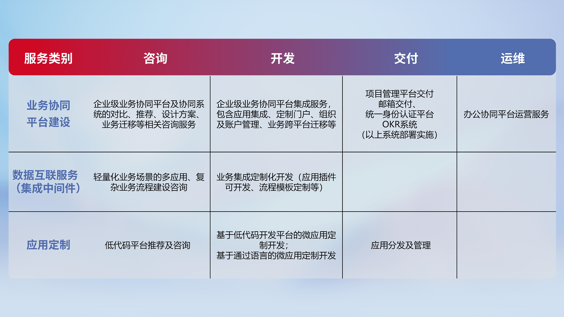 针对钉钉、、、、企微、、、IDaas等平台级产品提供产品的规划、、、方案、、交付、、定制化开发等服务,,,实现如统一协同办公、、、智能客户服务、、混合会议管理、、、智能数据查询、、、、等业务场景,,,,实现数字化转型。。