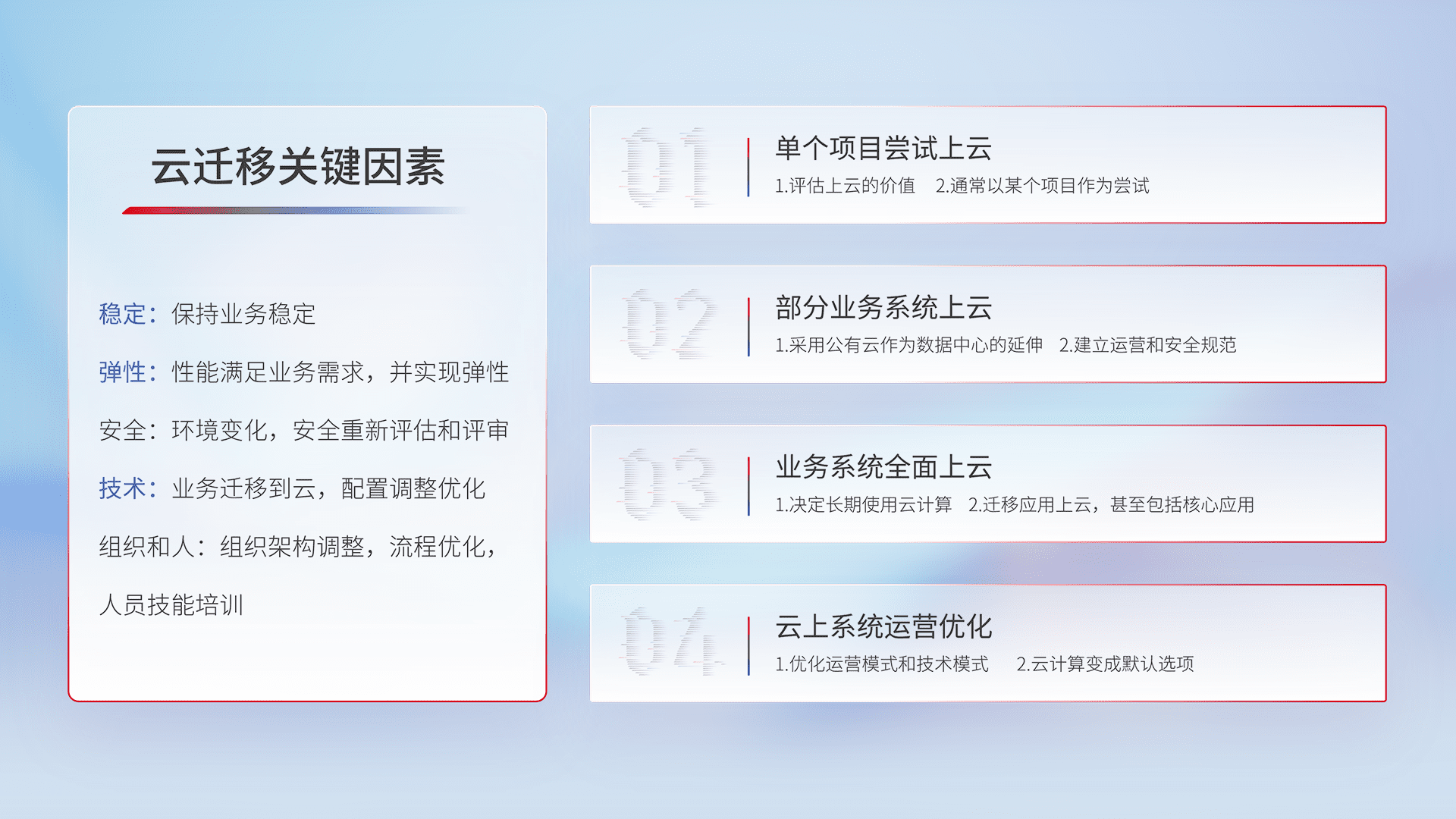 结合实际业务,,,,从规划设计、、云平台选型、、、云原生改造、、数据迁移、、、、集成交付,,,迁移全过程为客户识别最佳上云路径,,做好风险识别管理,,,,设计网络架构、、、身份权限、、安全审计合规、、操作审计、、、、日志审计、、、监控告警策略、、、多站点容灾设计等,,对云上基础设施进行整体规划,,提升IT治理水平,,以满足弹性、、、、高可用、、、高性能的需求。。。。